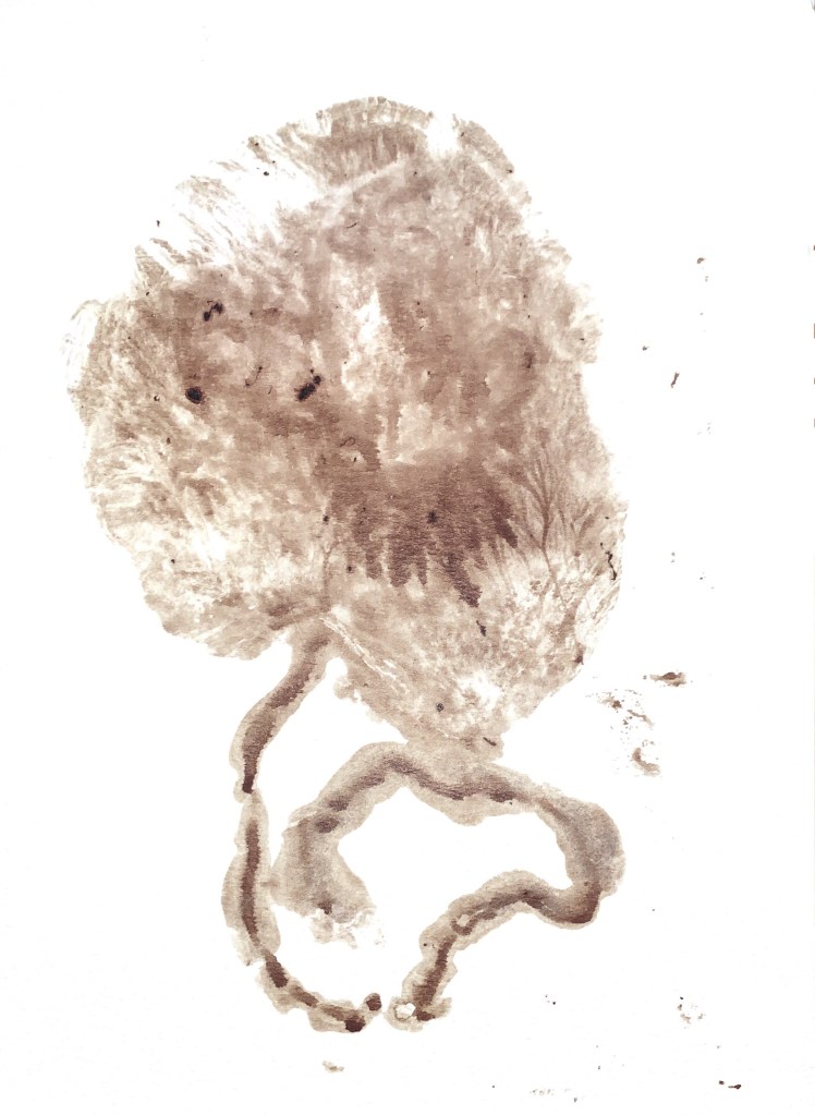 Un peu plus tard, ma sage-femme me montre mon placenta et m’explique chacune de ses partis et fonctions. Je suis fasciné par cet organe qui a nourri ma fille pendant 9 mois. On fait des empreintes de celui-ci sur du papier que j’avais apporté pour l’occasion. Je souhaite garder un souvenir de son arbre de vie. L’infirmière nous regarde avec un air un peu bizarre, elle semble vraiment surprise de mes demandes, soit de toucher mon placenta et de faire les empruntes… mais ça m’importe peu. C’est mon moment, notre moment à nous.